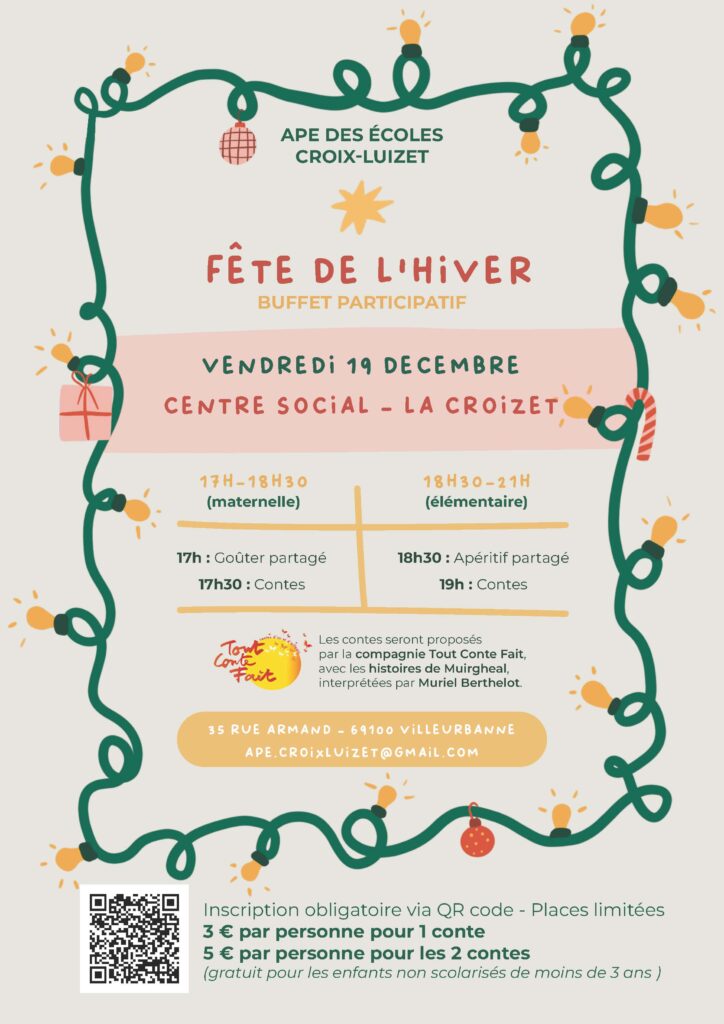 L’APE Croix Luizet a le plaisir de vous inviter à la Fête de l’Hiver, le vendredi 19 décembre 2025, placée cette année sous le signe du conte.